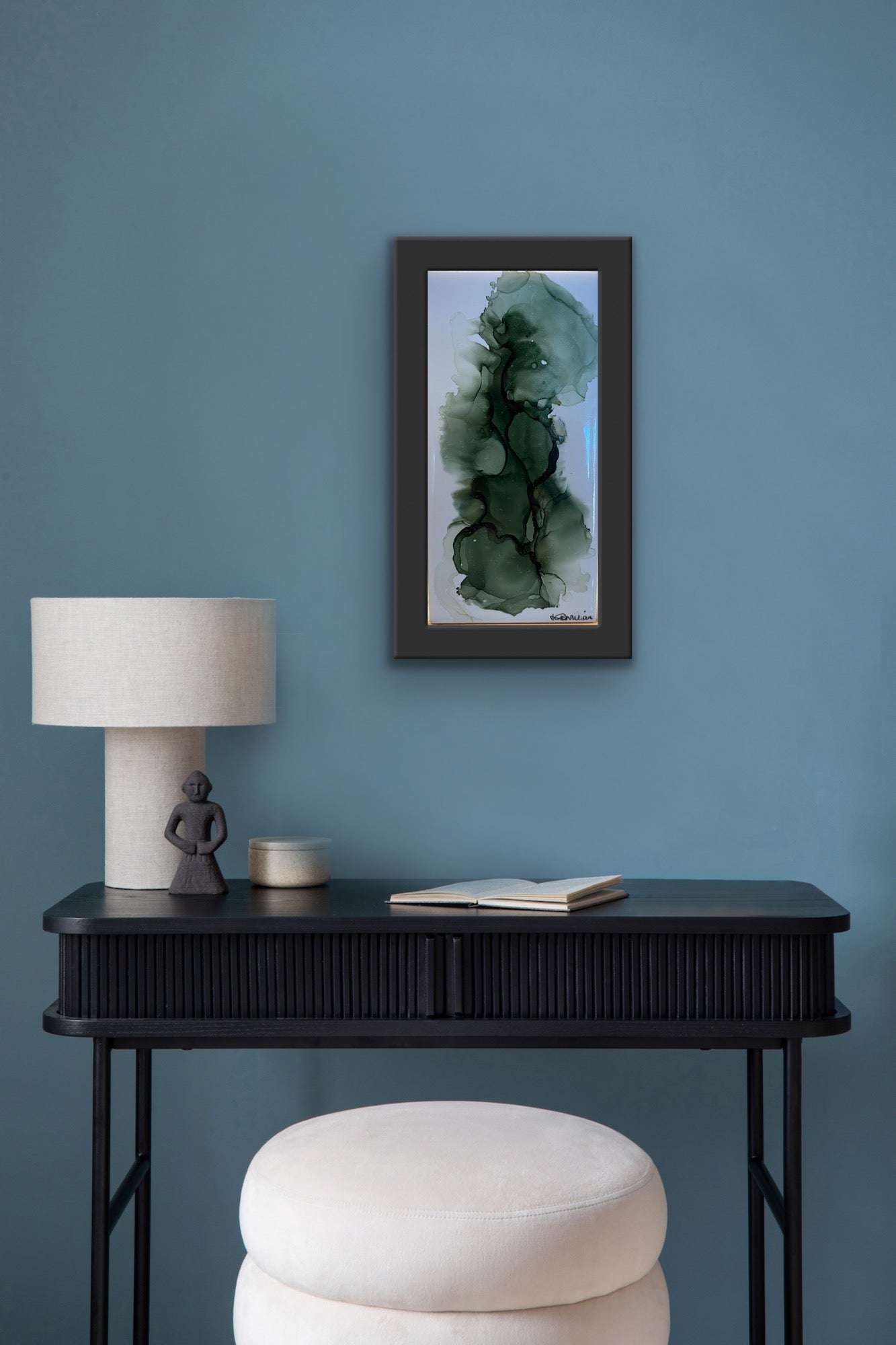 In the Mix invites you into a moment of pure visual discovery. This 6 x 3 inch piece swirls with moss green—a color that feels both grounded and alive. It's an abstract meditation on movement and texture, where what you see is exactly what draws you in. Perfect for adding a touch of organic elegance to any space.